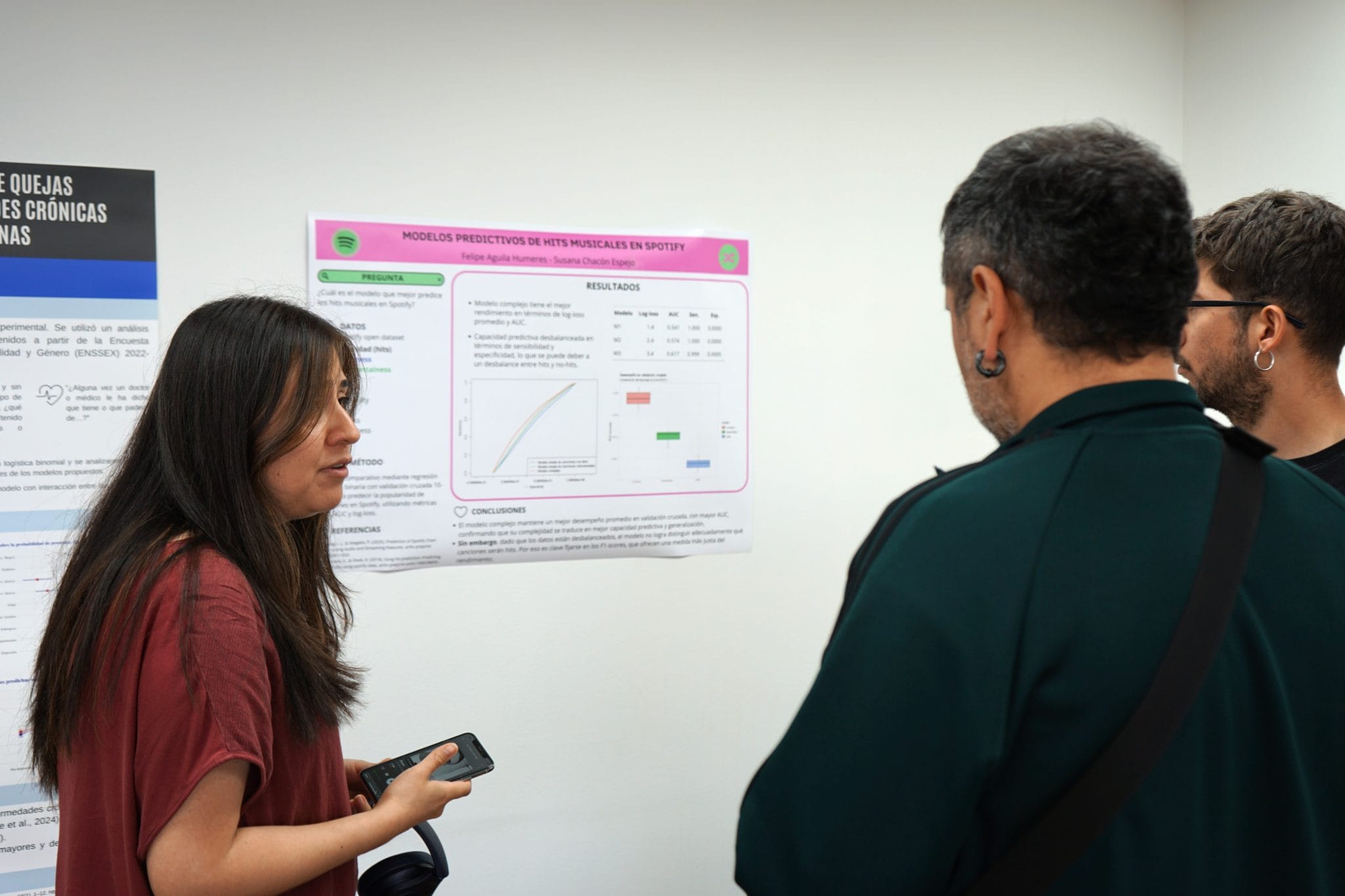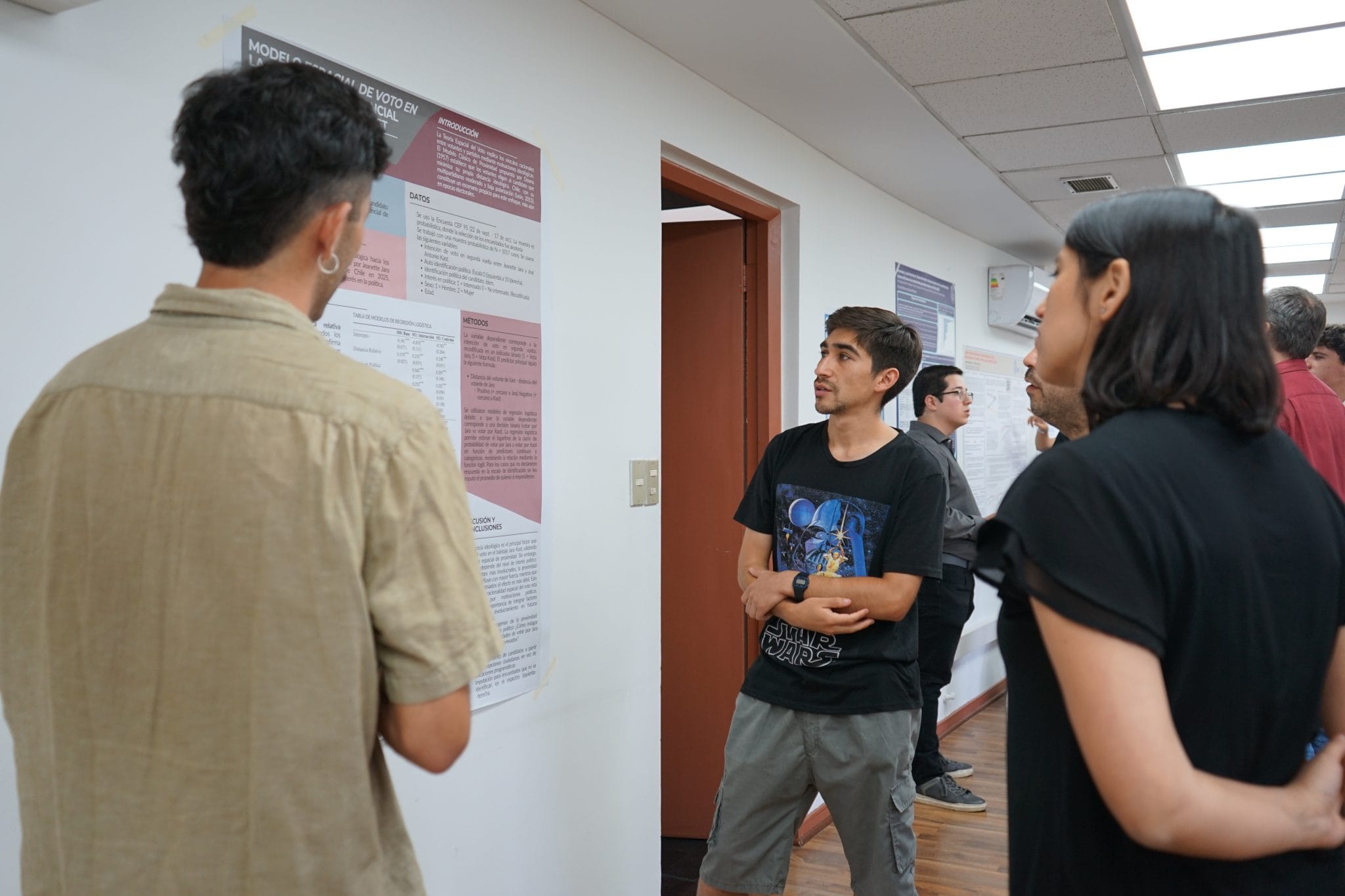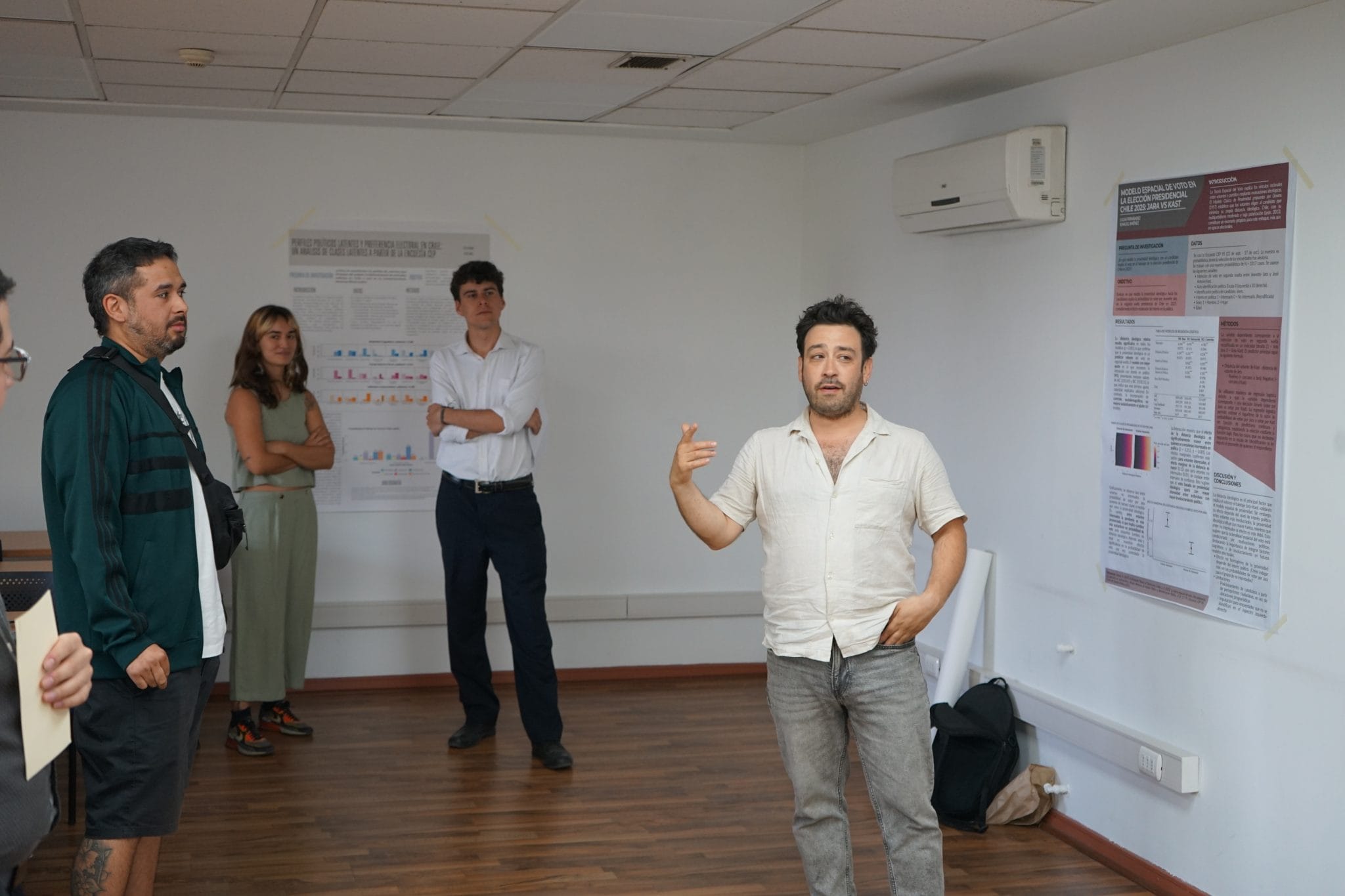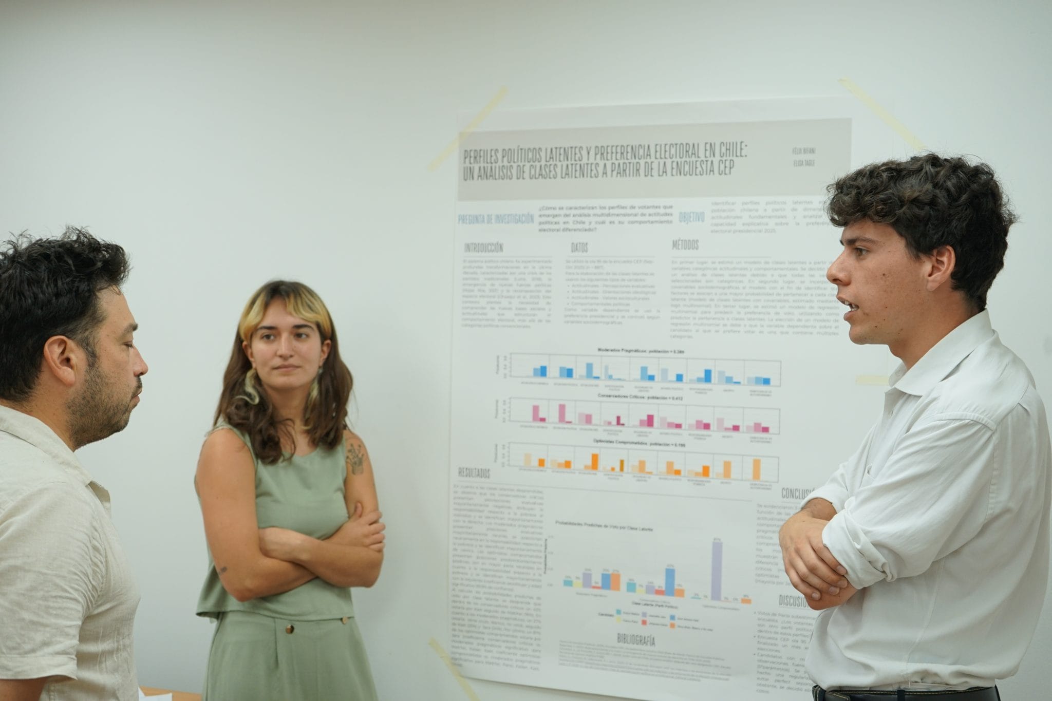 NoticiasCurso Análisis de Datos categóricos: investigadores exponen en sesión de pósters académicos Posted on 25/11/202525/11/2025 by sociologia Informaciónface Información periodísticaTomás HerreraCoordinador de Comunicaciones y Extensióntiherrera@uc.clinsert_drive_file Unidad Facultad de Ciencias Socialeslocal_offer TemasMagisterDoctoradoAnálisis de Datos CategóricosLos estudiantes del curso de Análisis de Datos Categóricos, dictado por el profesor Mauricio Bucca, ayer presentaron a la comunidad de investigadores los distintos resultados de sus investigaciones en una sesión de exposición de pósters académicos en la Sala de Magíster del Instituto de Sociología. La exposición fue una oportunidad de presentar sus trabajos finales en el formato de simulación de sesión de pósters en una conferencia científica. En la sesión participaron tanto estudiantes del magíster como doctorado en Sociología. Los estudiantes aplicaron distintas metodologías cuantitativas para el análisis de datos, así como la exposición de los resultados obtenidos. Entre las temáticas abordadas en los pósters estuvo tanto el análisis de encuestas políticas para la determinación de preferencias democráticas en las elecciones presidenciales, la predictibilidad del voto en relación a la proximidad ideológica con un candidato o los perfiles políticos latentes. También los pósteres abordaron modelos predictivos para grandes bases de datos — por ejemplo de Spotify —; la asociación entre la presencia de quejas cognitivas subjetivas y enfermedades crónicas en personas mayores, análisis de capital cultural para la determinación de perfiles lectores, el gasto gubernamental y probabilidades de éxito en la Copa Libertadores o un análisis de determinantes para terminar la enseñanza media en Chile. Los trabajos presentados incluyeron:Determinantes de terminar (o no) la enseñanza media en Chile: un análisis por educación de los padres, género y nivel socioeconómico, por Diego Mansilla y Nicolás PobleteAmenaza y autoritarismo: determinantes socioculturales de las preferencias democráticas en las elecciones presidenciales de Chile 2025, por Jairo Pérez y Nicolás Williams¿El Estado en la Cancha? Gasto gubernamental y probabilidades de éxito en once países de la Copa Libertadores entre 2011 y 2024Capital cultural objetivado e institucionalizado en Chile: determinantes de perfiles lectores a partir de ENPCCL (2024), presentado por Yepsen Marambio y Zavala AránguizAsociación entre la presencia de quejas cognitivas subjetivas y enfermedades crónicas en personas mayores chilenas, presentado por Consuelo Sepúlveda Ibarra, estudiante del Doctorado en PsicologíaModelos predictivos de Hits Musicales en Spotify, presentado por Felipe Águila Humeres y Susan Chacón Espejo Contenido relacionado Curso Análisis de Datos categóricos: investigadores exponen en sesión de pósters académicos Cierre del curso de Análisis de Datos Categóricos impartido por el profesor Mauricio Bucca en [...] 25 Nov Cambio de mando del Centro de Estudiantes Sociología UC (CESO) para el periodo 2026 Traspaso de mando a los estudiantes elegidos como parte del Centro de Estudiantes de Sociología [...] 24 Nov Felipe Torres realiza estadía de investigación en Alemania Durante octubre y parte de noviembre, el profesor Felipe Torres realizó diversas actividades en el [...] 18 Nov Nueva versión del curso de Sociología del Medioambiente Profesor Manuel Tironi realiza en el sur de Chile nueva versión del curso de Sociología [...] 13 Nov Ulda Figueroa, nuevo doctor en Sociología El investigador, coordinador del área de Justicia del Centro Justicia y Sociedad UC, Ulda Figueroa [...] 05 Nov Doctorantes ISUC presentan sus investigaciones en Coloquio de Doctorados Estudiantes del doctorado en Sociología presentaron los avances de sus investigaciones doctorales ante profesores y [...] 04 Nov Miski Peralta y Daniella Leal, nuevas doctoras en Sociología UC Las investigadores Daniella Leal y Miski Peralta defendieron exitosamente sus tesis de doctorado. 29 Oct CEVE UC realizó la 5ª versión de la Semana Gerontológica centrada en la soledad, el aislamiento y las conexiones sociales La quinta versión de la Semana Gerontológica, organizada por CEVE UC, estuvo dedicada a la [...] 28 Oct